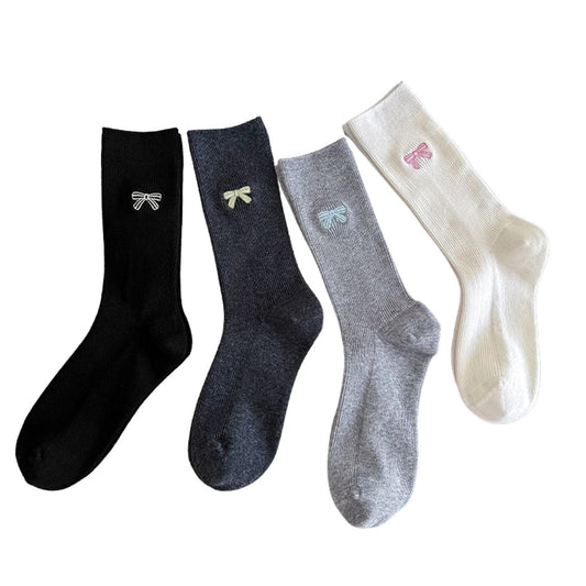 夏日薄款蝴蝶結刺繡運動中筒襪